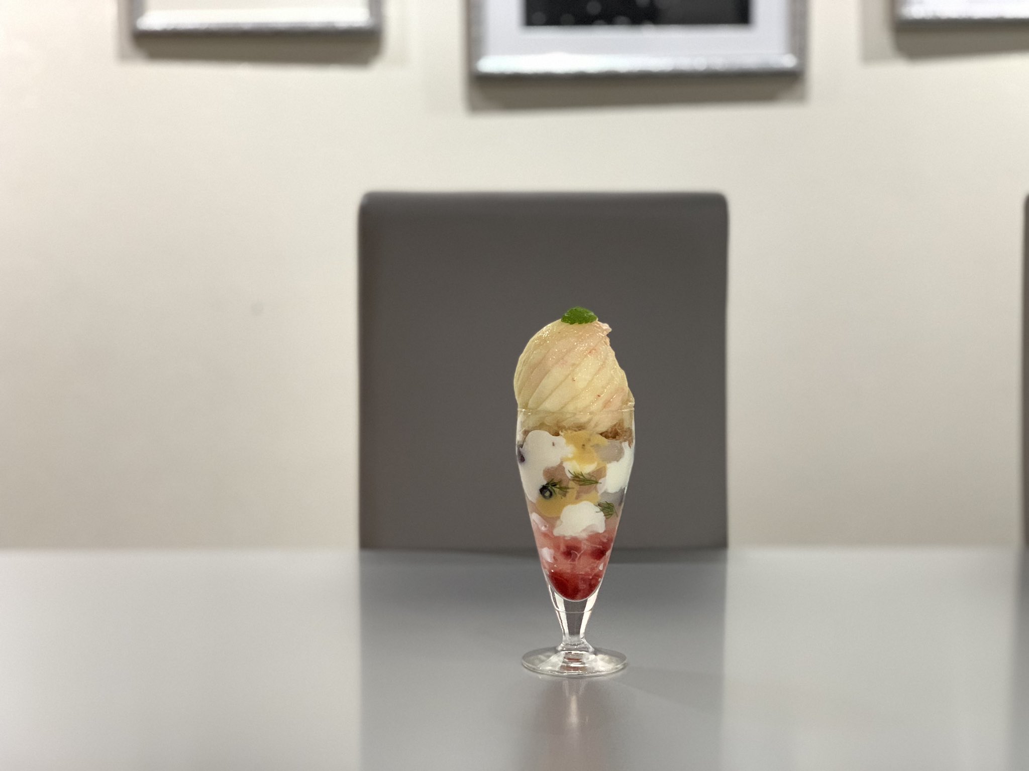 Sweets Cafe Gallery Sesshi 昨年からスタートしている 印象派パフェシリーズ 昨年はクロード モネ モネの睡蓮 でした 今年はピエール オーギュスト ルノワール 桃を描いたルノワール が パティシエになったらこんなパフェを作ったかもしれない桃